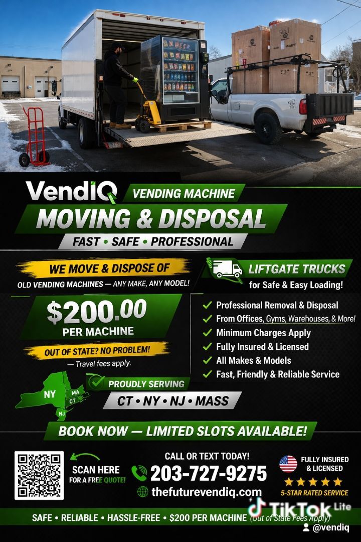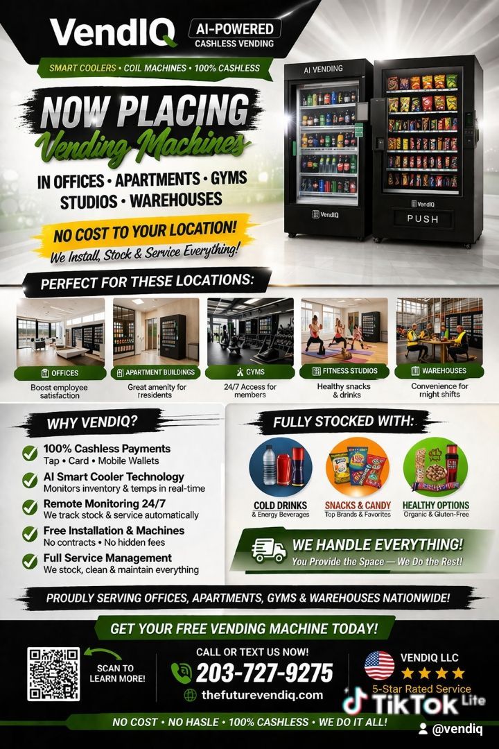 VendIQ AI Smart Cooler and Cashless Coil Machines is the smarter, more profitable way to operate modern vending machines. Designed for today’s consumers and business owners, VendIQ combines advanced cashless technology with real-time data to maximize sales and simplify operations. We also finance our machines. *Inquire within*